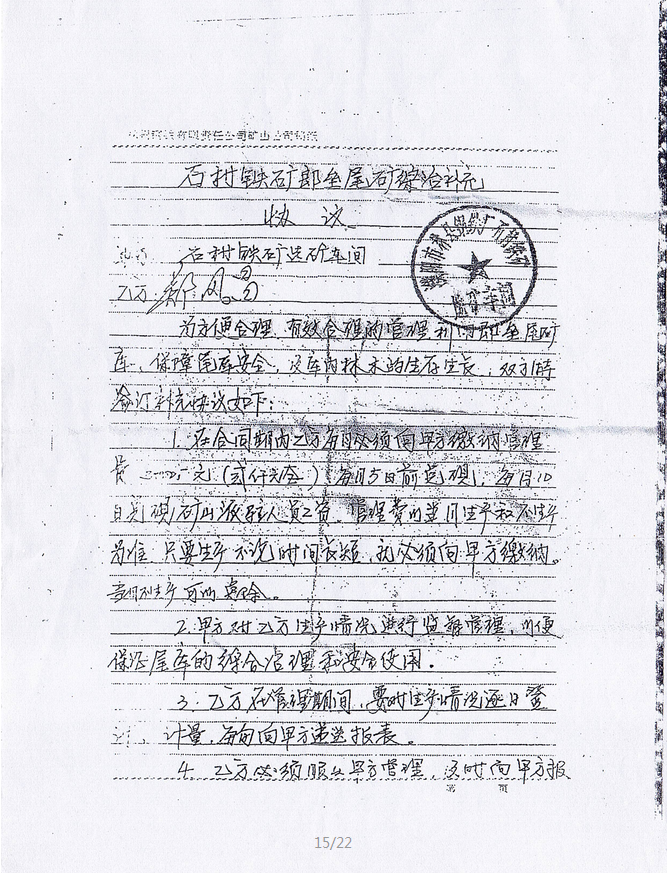 为了响应政府号召,实施林州郎垒尾矿坝综合治理方案,我从2004年8月1日参与尾矿坝综合治理,2006年4月6日濮阳市钢铁有限责任公司石村铁矿给我签订《郎垒尾矿坝库综合治理补偿协议书》(附后1),该尾矿库是1996年经华北冶金设计研究院编制闭库方案停止使用,按照协议约定我们在库区北部选砂,完成库区平整、土地复垦、栽种树木,并对此做好看管工作。