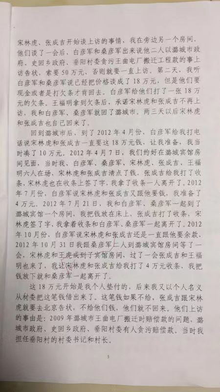 第5页第一行至第五行,再见宋有良的询问笔录:“我在旁边另一个房间,他们谈了一会后,白彦军和桑彦军出来说他二人以潞城市政府、史回乡政府、垂阳村委贪污王曲电厂搬迁工 程款的事上访告状,索要50万元,否则就要一直上访。第二天,我听白彦军和桑彦军说已经把价格谈成了18万元,但是他们要现金或者是打欠条才肯回去。白彦军给他们打了一张18万元的欠条。王福明拿到欠条后, 承诺宋林虎和张成吉不再上访。”